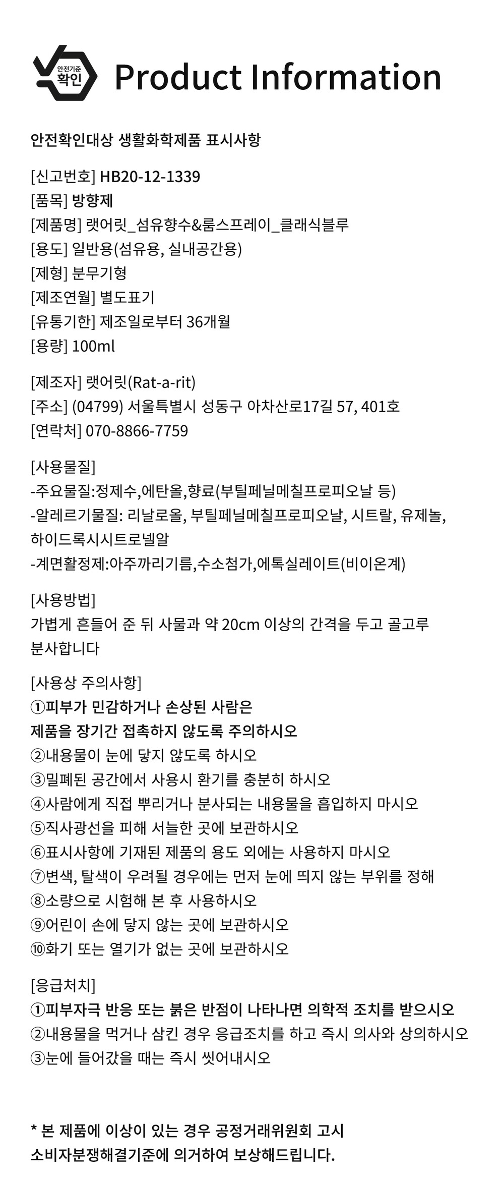 - 상품 수령 후 7일 이내에 랫어릿으로 연락을 주셔야 합니다.