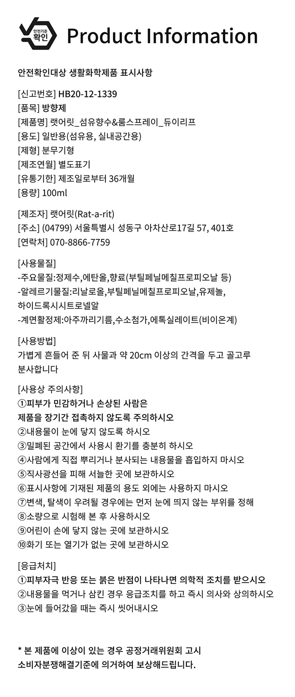 - 향조 노트(향취)와 발향력이 개인과 안 맞는 경우 (단순 변심으로 인한 향 교환/반품 불가)